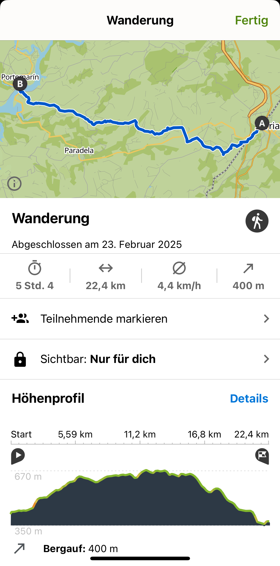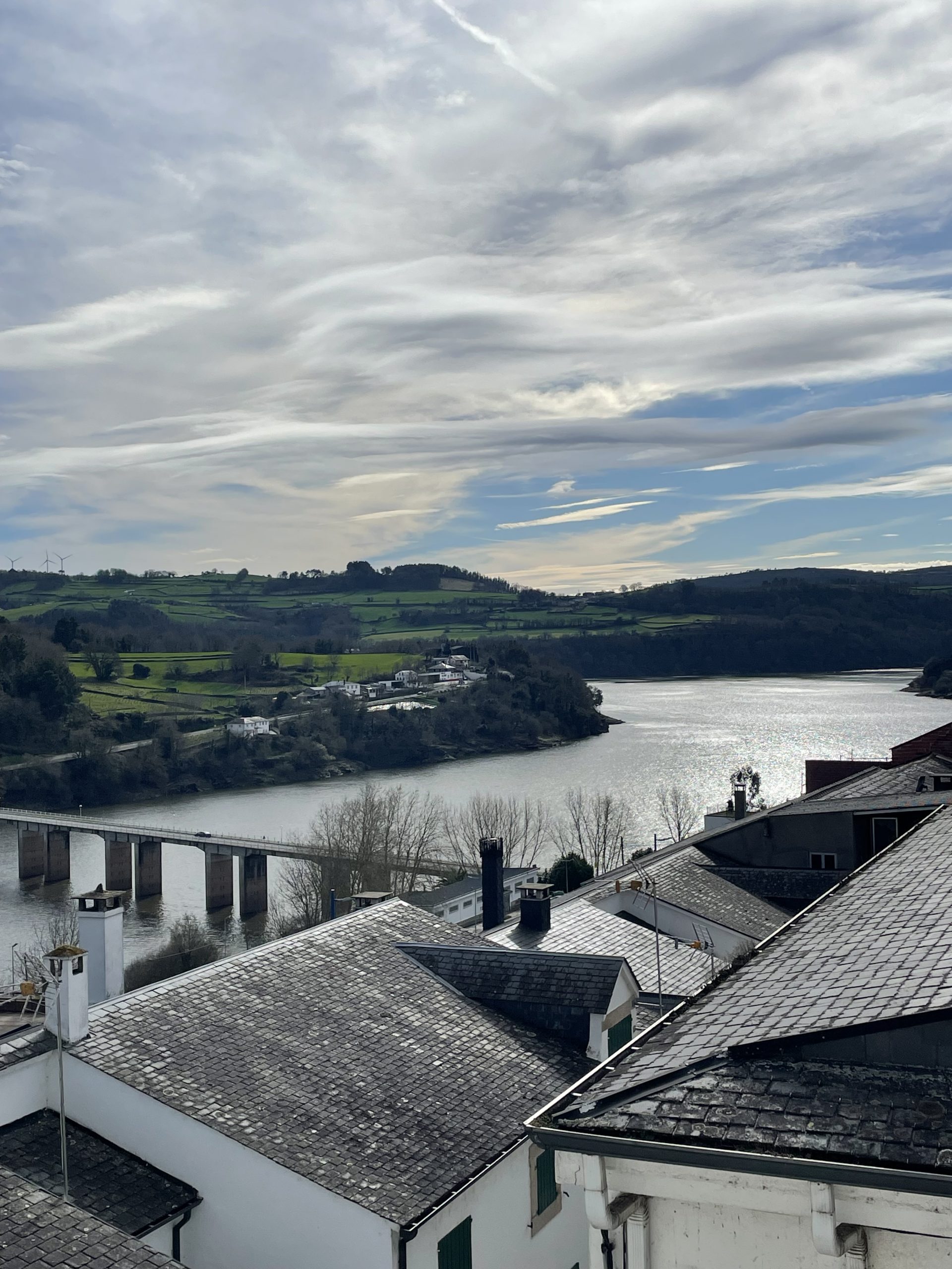 Die Strecke hatte es mit 400 Höhenmetern bergauf durchaus in sich, aber die atemberaubende Aussicht auf die galicische Landschaft hat die Anstrengung mehr als wettgemacht. Nach 22,4 km sind wir gegen 16:00 Uhr endlich in Portomarín angekommen. Die Brücke über den Stausee und der Anblick der Stadt auf dem Hügel waren ein beeindruckendes Finale dieser ersten Etappe.